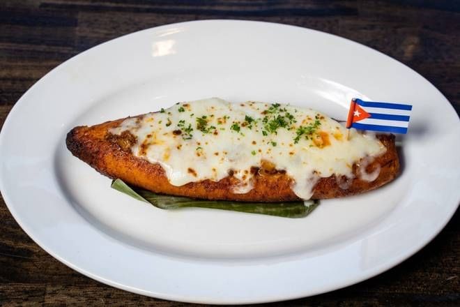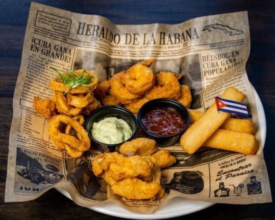 Pork crackling, ham croquets, stuffed potato, corn fritters, beef empanadas, Cuban tamale, and spicy mambo sauce