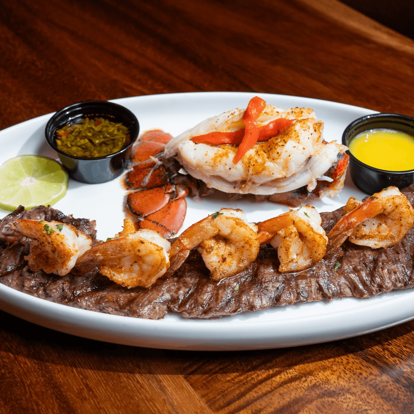 Pork chops, grilled chicken, skirt steak, shrimp, and chorizo
