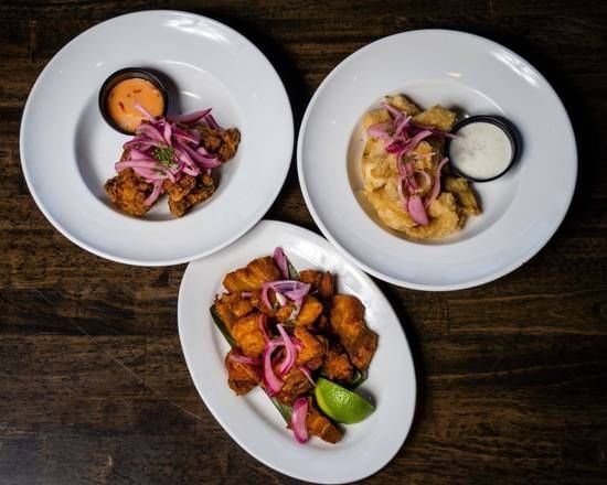Lightly fried marinated pork or chicken, topped with pickled onions, and cilantro crema